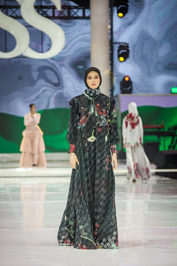 PALESTINE COLLECTION: Babak selanjutnya bercerita tentang simpati dan keprihatinan Shella terhadap tanah Palestina. Sepuluh gaun anggun hadir dalam bahan putih dengan sentuhan motif bunga-bunga yang berpadu harmonis dengan motif geometris dalam warna hijau, merah, hitam khas Palestina. Hasil penjualan busana koleksi ini akan langsung didonasikan untuk warga Palestina korban perang.